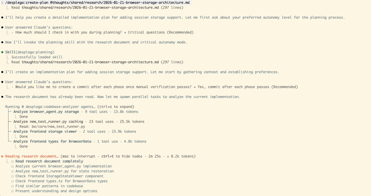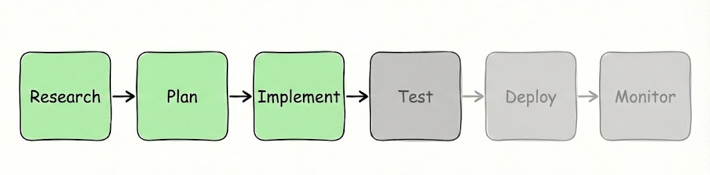 Once you have an objective, you start a research on how your current solution, and existing libraries work. It could be a highly intensive process, hence we usually rely on multiple agents, MCPs, and other plugins that investigate the web, architecture, DB, infrastructure, code (even the deprecated one), libraries, docs, etc.