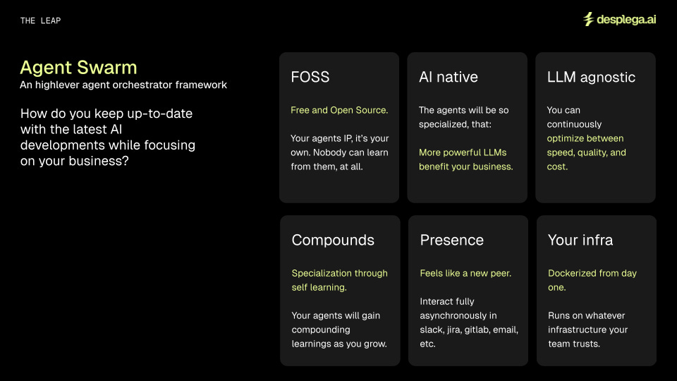 When we decided to Open Source our Agent Swarm, it was a result of hearing: “Tell me how you are doing it, we are trying to do the same” multiple times during December. It was a wake up call. The top startups in Barcelona, the ones we aspired to become, were lagging here. Furthermore, they couldn’t comprehend what we were already doing. It looked like magic to them. Since then, our swarm kept improving with self-learning, supporting multiple LLMs, and expanding beyond Software development. But that’s not the amazing thing, the amazing thing is the community around it.