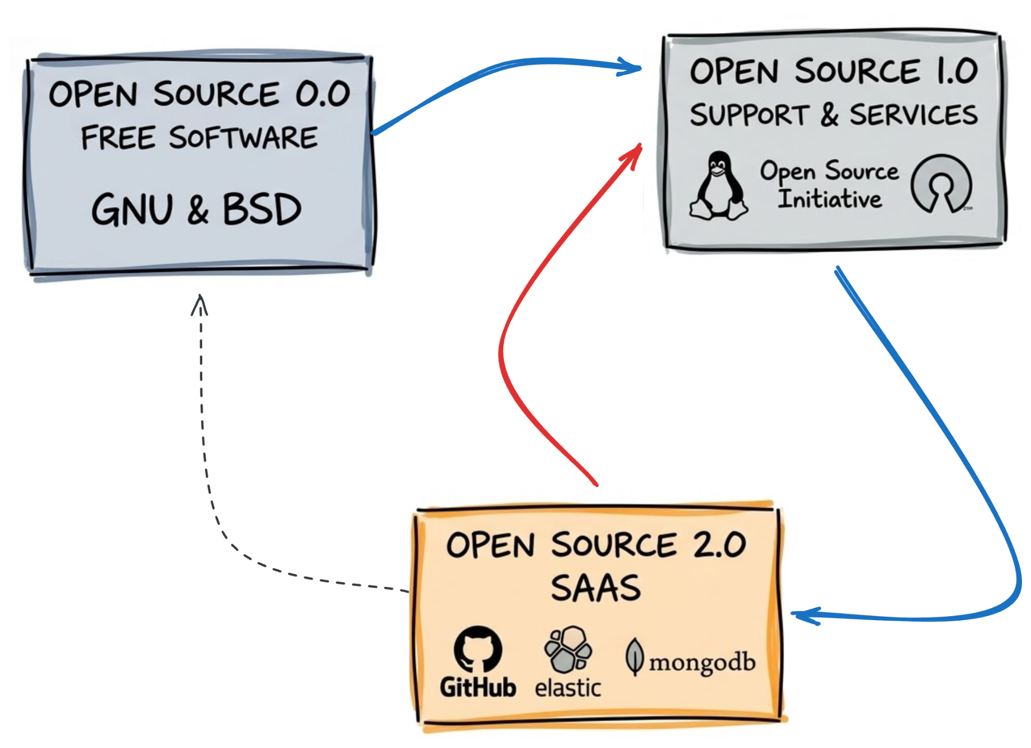 The interesting part is not how the business evolved, but that in every stage the advantage of choosing an open source solution stayed the same for businesses. You could always have the assurance that choosing Open Source meant low lock-in, and protected IP on your business layer.